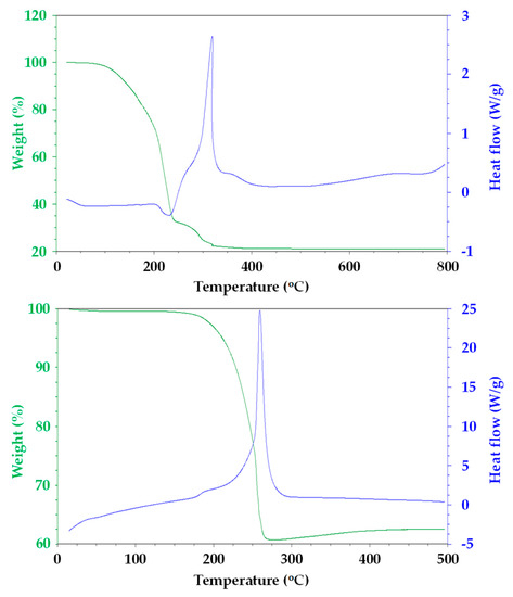 Thermal gravimetric and heat flow data from (top) CeO2 and (bottom) MnO2 pastes. Exotherm is up on the heat flow data.