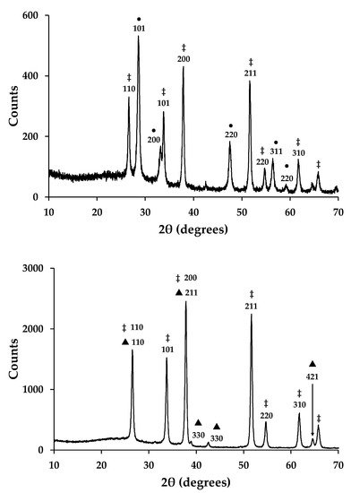 X-ray powder diffraction data for mesoporous films of (top) CeO2 and (bottom) MnO2 showing indexed diffraction peaks. Key: ‡ = SnO2, ● = CeO2, and ▲ = MnO2.