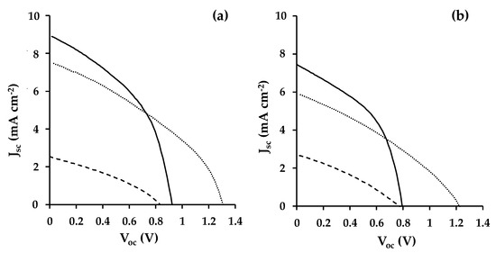 PSC I-V data scanned from (a) open circuit to short circuit and (b) short circuit to open circuit fabricated using metal oxide scaffolds consisting of TiO2 (solid line), CeO2 (dashed line), or MnO2 (dotted line).