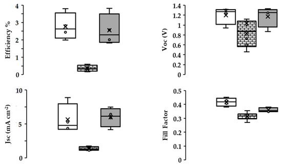 Box plots of (top left) device efficiency, (top right) Voc, (bottom left) normalized Jsc and (bottom right) fill factor. TiO2, CeO2, and MnO2 scaffold devices are represented by white, brick and grey fill, respectively. The data for each treatment are from 4 devices each with three pixels representing 12 measurements per sample.