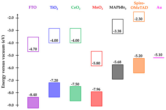 Energy level diagram for TiO2, CeO2, and MnO2 metal oxide scaffolds and CH3NH3PbBr3 (MAPbBr3) perovskite absorber showing conduction bands (clear boxes) and valence bands (shaded boxes). The spiro-OMeTAD hole transport material (HTM) and electrode materials-fluoride-doped tin oxide (FTO) and gold are shown for clarity.