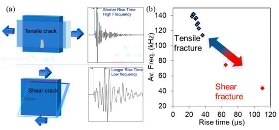 (a) Schematic representation of fracture modes and corresponding acoustic emission (AE) waveforms; (b) Av. Freq. vs. rise time plot from bending of textile-reinforced cement (TRC) beams taken from [18].