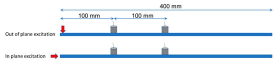 For the pencil lead break measurements, two AE sensors, resonant at 150 kHz, were placed with a separation distance of 100 mm, while the first was placed another 100 mm from the edge of the plate or beam (see Figure 3). Excitations by the pencil lead (HB 0.5, length approximately 4 mm) took place both at the top plane, creating thus an out-of-plane excitation (top of Figure 3) as well as at the vertical side of the specimen to produce in-plane motion (bottom of Figure 3). Because of the orientation of the excitation, the first case can be considered close to an axial defect or a delamination in the TRC plate or beam, while the latter is closer to a matrix crack that may open due to tension. The waveform analysis focuses on the response of the furthest sensors at 200 mm from the excitation, while the first sensor was used for experimental reference and triggering purposes. Propagation speed, as measured by the onset of the waveforms between the first and last receiver was 2730 m/s.