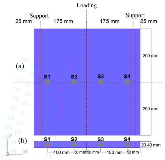 Schematic representation of three-point bending loading points and supports, and sensors distribution for both: (a) TRC plate and (b) TRC beam. S1 to S4 stand for AE sensors.