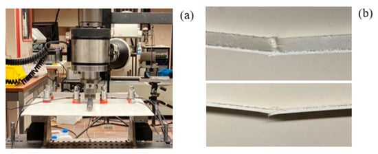 Similar TRC specimens have been studied recently and their manufacturing is shown in [17,18]. For completeness, the basic details are also reported here. The matrix consists of inorganic calcium phosphate cement (IPC), which is a mixture of a calcium silicate powder and a phosphoric acid-based solution of metal oxides. The weight ratio of powder to liquid is 0.8. For the mixing a Heidolph RZR 2102 overhead mixer (Analis, Suarlee, Belgium ) was used. First, the liquid and the powder were mixed at 250 rpm until the powder was merged into the fluid, after which the speed was increased to 2000 rpm. E-glass chopped fiber mats with a surface density of 300 g/m2 (Owens Corning M705- 300, Owens Corning, Brussels, Belgium ) were used as reinforcement. TRC laminates were made by hand layup with an average matrix consumption of 800 g/m2 for each layer, which results in an average fiber volume fraction (Vf) of 20%. The laminates were cured in ambient conditions for 24 h. Post-curing was performed at 60 °C for 24 h while both bottom and top planes were covered with a plastic film to prevent early liquid evaporation. Plate and beam samples were cutoff from the different laminates. The dimensions of the TRC plate were 400 × 400 × 2.5 mm3 and for the beam they were 400 × 20 × 4.5 mm3. A photograph of the specimens is shown in Figure 2.
