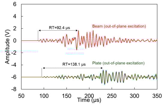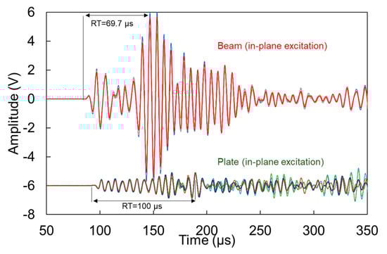 The waveforms for the out-of-plane excitation, are shown in Figure 7. This excitation implies that the dominant mode is the “antisymmetric” A0, which is arguably slower than the symmetric (S0) [10], as will also be demonstrated below. Therefore, reasonably the main content of the waveforms arrives later, resulting in longer RT values than the corresponding cases of Figure 6. Again, as the wave in plates spreads in two dimensions, it is reasonable to expect lower amplitude for the plate than the beam. In addition, the strongest burst of energy arrives later in the plate geometry than the beam. This influences the RT of the waveforms with the plate RT being 40% longer, while the amplitude is approximately half. This is attributed to the aforementioned spreading of the energy on the plate geometry, as well as the possible absence of reflections from the edges, that are bound to influence the beam in a stronger way.