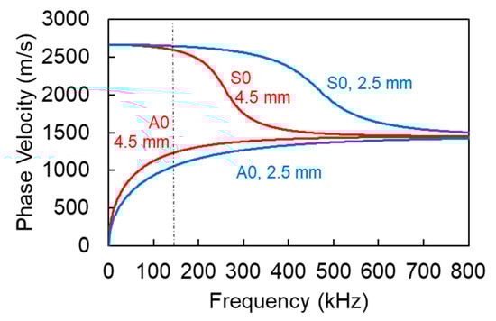 Figure 8 demonstrates the calculated indicative dispersion curves for both thicknesses and material with longitudinal and shear wave velocities 3000 m/s and 1550 m/s respectively. The results show that for the frequency of interest (sensors resonant at 150 kHz) the S0 mode for both cases is expected much faster than the A0, with phase velocities of approximately 2600 m/s and 1100 m/s respectively. This is also in accordance with the experimental observation that most of the content of the waveform from in-plane excitation arrives earlier than the out-of-plane, which can be seen by the shorter RT values in Figure 6 than the RT values of Figure 7. Differences related to the thickness are much smaller and specifically for the S0 the difference is less than 40 m/s and thus may not have a certain effect on the onset of the waveforms. The difference is a little higher for the A0 mode, where the thick laminate exhibits 170 m/s higher velocity than the thin one, something that could contribute to the shorter RT exhibited by the beams compared to the plates and seen in Figure 6 and Figure 7. It should be highlighted that these dispersion curves are theoretical and that in practice both wave modes are present; therefore, strong differences in the onset of the waveforms are not seen because of the S0 arrival in both cases with more or less the same velocity. Differences are more pronounced in the amplitude axis, where the in-place excitation results in much higher S0 burst than the out-of-plane one.