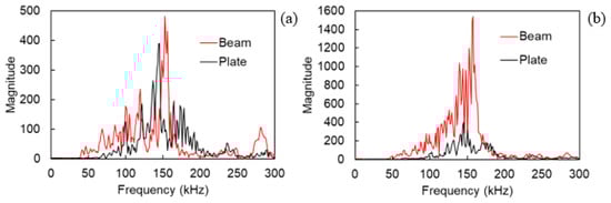 Concerning the frequency content in the present study, a dramatic change in the bandwidth between beams and plates was not observed (Figure 9). The waveform of the beam exhibits obviously higher magnitude for both excitations, something consistent with its higher time domain amplitude, but the content lies in the same band as in the plate (essentially 50 to 200 kHz). Still one difference can be seen, concerning the maximum peak (peak frequency, PF), which for the beam is in both cases higher than 150 kHz while for the plate is just below that value, as also seen in Table 1. In any case, the specific sensors are resonant at 150 kHz and therefore, any difference is reasonably compressed around this value.