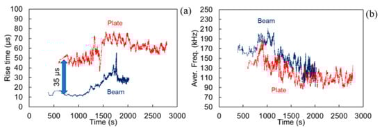 Since the focus of the paper is not the load-bearing capacity of the materials, load histories are not presented for brevity. Figure 10a demonstrates the RT as received by the sensor S2 (50 mm from the center) for both the plate and the beam specimen. The data are presented in terms of their sliding average of 200 points. The sliding average is a suitable way to represent AE data in order to show the general trend, compressing the high experimental scatter which is inherent to fracture and therefore, the AE data [6,35]. For the beam, RT early values stand at approximately 15 μs, while the plate exhibits a much higher average at approximately 50 μs. These data recorded at the beginning of the test and at low load levels can be safely attributed to matrix cracking in both cases, showing how differently the same type of source is recorded in a beam and a plate specimen. Later, as is normal for this material, RT increases symbolizing the gradual shift to shear events like pull-out and delaminations. Concerning the frequency characteristics, still a difference can be observed in Figure 10b, but it is much milder, something expected because of the resonant behavior of the sensors. Matrix cracking is exhibited with an average value of 170 kHz on the beam and with approximately 140 kHz on the plate.