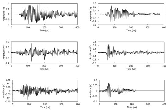 During the test several thousands of AE waveforms were recorded. Selecting and presenting “representative” ones is a challenge but it is always important to manifest the raw information, from which the parameters are calculated. Therefore, five waveforms were selected from the early loading stage of the beam and the plate (within the first 300 recorded events), attributed, therefore, to matrix cracking. They were chosen based on the similarity of their parameters to the average of the class, as shown in Table 2. These waveforms are depicted in Figure 11, while Figure 12 shows the localization results for these 300 first events, confirming that the sources mostly stand at the middle zone of the span, where the bending moment is maximum and the material more prone to cracking.