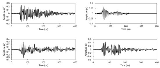 Figure 6 shows typical waveforms after pencil lead break on the side of the beam (or plate) simulating a matrix crack (in-plane excitation), as received by the furthest (2nd) sensor. Waveforms from four individual excitations are included to show the repeatability of the test. The energy is quite strong as evidenced by the relatively large amplitudes. Specifically, and despite the 200 mm long propagation, the amplitude on the beam reaches 6 V, corresponding to 95 dB in the system. For reference, it can be said that the 1st sensor at 100 mm recorded a saturated waveform at 10 V (not presented), which is the limit of the acquisition board. In the response of the 2nd sensor shown on top of Figure 6, a weak separation of modes is formed, with the first burst at 100 μs and the second peaking at 150 μs. The corresponding sensor on the plate geometry shows a much lower amplitude (bottom of Figure 6) because of the spreading of the wave front which is essentially restrained in the beam geometry. Additionally, its peak comes clearly later reaching a RT of 100 μs, longer compared to the RT of the corresponding signal on the beam (69.7 μs).