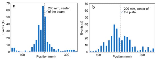 Linear AE localization distribution for the first 300 events of the (a) beam and (b) plate specimens.
