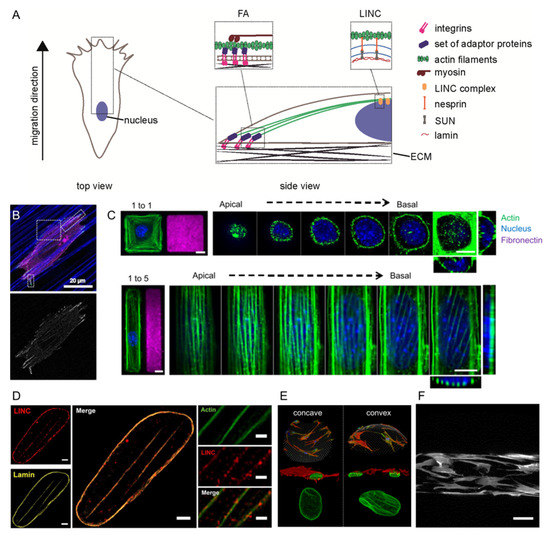 Cellular adhesions to the substrate, the cytoskeleton, and the nucleoskeleton all play important roles in how adherent cells sense geometrical cues of their substrate. When a cell adheres, spreads, and polarizes on a substrate, actin polymerizes into fibrils, forming filamentous actin (F-actin). F-actin pushes the plasma membrane forward, creating a leading edge protrusion. Integrins in the plasma membrane function as anchorage points to the substrate. Integrins are intermembrane proteins with an extracellular tail and an intracellular tail [49]. Activated integrins attach with their extracellular tail to ECM molecules such as fibronectin, vitronectin, collagen, and laminin, while the intracellular component of the protein is attached to F-actin through adapter proteins (such as talin). This connection forms a nascent adhesion of the cell with the substrate [50]. F-actin can further organize into higher order structures called stress fibers. These stress fibers contain crosslinked F-actin and non-muscle myosin motor proteins. This composition enables stress fibers to contract [51,52]. Following F-actin polymerization at the leading edge, the F-actin networks are moved backwards towards the cell center. This F-actin retrograde flow, resulting from F-actin polymerization and myosin contractility, creates a force directed towards the center of the cell on the nascent adhesions [53,54,55]. The traction force pulls on the adhesions and thereby drives the maturation of focal adhesions (FAs) by triggering a cascade of events where integrins cluster together and large number of adapter proteins (such as focal adhesion kinase (FAK), paxillin, and vinculin) are recruited and subsequently activated to strengthen the bond of the ECM to the cytoskeleton of the cell [50,56]. Thus, FA represents the protein complexes that physically link the intracellular cytoskeleton to the extracellular matrix. FAs function as a so-called molecular clutch. When a force applied on the adhesion is below a certain threshold, the FA disintegrates, however a force above the threshold further strengthens the adhesion [57,58,59].