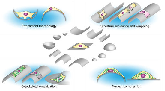 The above mentioned studies suggest a delicate interaction between cellular bending, stress fiber organization, and compressive forces on the nucleus that together orchestrate the cellular response towards curved substrates (Figure 3). It is of interest to directly compare various cell types with differently organized cytoskeletons on anisotropic curved substrates (e.g., cylinders) in the future. In particular, a comparison of cells that naturally possess pronounced apical stress fibers (such as fibroblasts and mesenchymal stromal cells) with cell types that do not have aligned apical stress fibers or possess a cortical cytoskeleton could advance our knowledge on the role of the cytoskeleton on the cellular orientation response on strut-like structures.