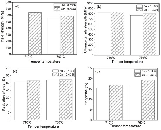 (3) After heat treatment, all the experimental steels showed excellent strength, ductility, toughness and hardness. The 0.42 wt.% Si steels after 1050 °C quenching and 760 °C tempering possess the best comprehensive mechanical properties considering the application to the reactor fuel cladding and structural materials.