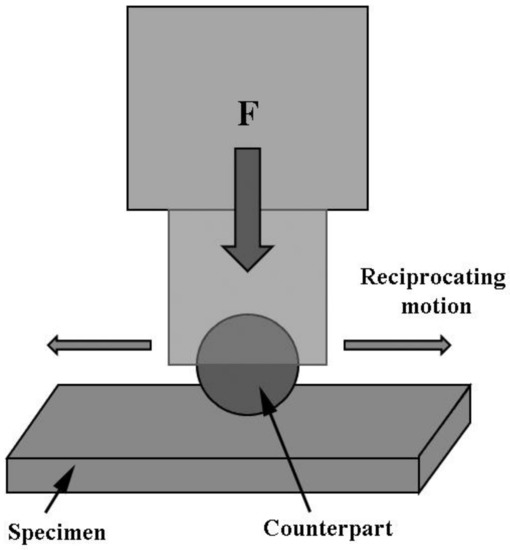 The wear test was carried out on a reciprocating friction and wear tester (HSR-2M, Zhongkekaihua, Lanzhou, China) with the wear condition of dry friction in an atmospheric environment. The schematic diagram of the friction and wear tester is shown in Figure 2. The counterpart selected was a SiC ball with a diameter of 6 mm. The indenter was operated at a load of 50 N at a frequency of 5 Hz. The running length was 5 mm, and the wearing time was 40 min. The cross-section areas of wear scars were measured by a three-dimensional profilometer (Nano map-500LS, AEP Technology, Santa Clara, CA, USA). Seven data were measured for each group. The wear ratio (w) was calculated by Equation (1) as follows: