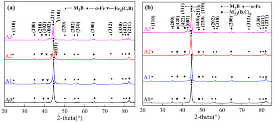 The XRD patterns of as-cast HBCS with different Mo contents are shown in Figure 3a. It was notable that the as-cast alloy A0 was composed of α-Fe, M2B (M represents Fe, Cr, and Mo), and Fe3(C,B). The main peak of α-Fe tended to move leftward due to the lattice distortion resulting from the larger atom radius of Mo, as displayed in Figure 3b. Besides, it is noteworthy that Fe3(C,B) dissolved into the matrix during heat treatment, accompanied by the precipitation of secondary phase M23(B,C)6.