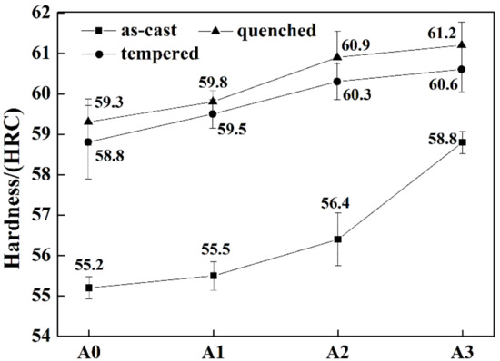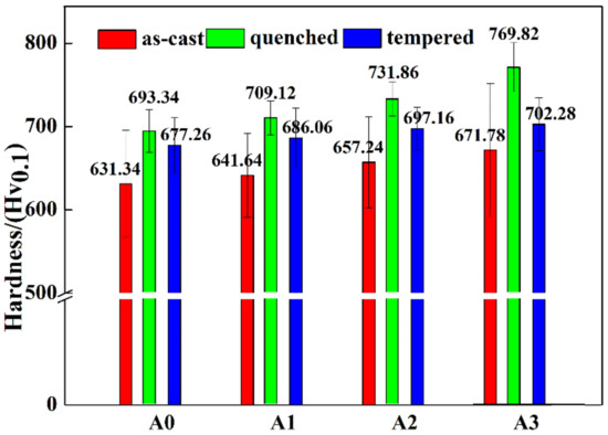 Hardness of the matrix of alloy A0, A1, A2, and A3 in as-cast, quenched, and tempered states.