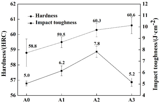 Hardness and impact toughness of heat-treated samples of alloys A0, A1, A2, and A3.