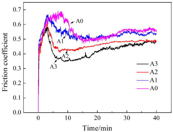 The friction coefficient of the samples is shown in Figure 13. As exhibited in Figure 13, with time prolonging, the friction coefficients of all the samples presented a similar trend that started with a dramatic increase, then followed by some reduction, and finally showed a slow and continuous rise. The reason for this change was that the samples would undergo a grinding-in period, which depended on the surface roughness, temperature, humidity, and so on. After a certain period of pre-grinding, the friction force and the roughness of the grinding surface tended to be steady, and then, it would go through the steady-wear stage. The friction required in the grinding-in period was greater than that in the steady-wear stage, which led to a relatively higher friction coefficient. With the ongoing of the steady-wear stage, the friction coefficient was slowly increased, which was attributed to the damage to the worn surface. Comparing the friction coefficient-time curves of all the samples, it could be concluded that the average friction coefficient of the steady-wear stage decreased with the increase of Mo content. The depth, width, and cross-sectional area of the wear scars were measured by the profilometer, as shown in Table 3. The parameters presented a tendency of declining with the increasing addition of Mo, indicating a slighter abrasion process and better wear resistance. As a result, the friction coefficient of the steady-wear stage was relatively lower when the Mo concentration was higher.