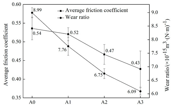 The wear ratio calculated by Equation (1) and the average friction coefficient in the steady-wear stage are shown in Figure 14. The average friction coefficient decreased with the increment of Mo content, and the wear ratio showed a descending tendency. It is well known that the excellent wear resistance depends on the good coordination between the matrix and hard phase [42]. According to the mechanical properties mentioned before, the hardness of matrix increased with the addition of Mo. On account of a synchronous wear process of the matrix and borides, the matrix with higher hardness possessed a better resistance to deformation and provided stronger support to the hard phase. Thus, the A3 sample showed better wear resistance. On the contrary, when the hardness of the matrix was lower, easier deformation occurred during wear process. Without the support of the matrix, borides would crumble and then be peeled off easily by the abrasive, which in turn would lead to further abrasion of the matrix. Such vicious cycles accelerated the abrasion process rapidly and brought about the poor wear resistance. The more severe wear process led to the higher friction coefficient when the content of Mo was lower.