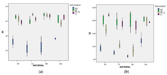 Similarly, but reversing the interaction architecture, it was found that, for INT groups, the pairs of SH vs. BR (p = 0.260), SH vs. EN (p = 0.327), and LV vs. BR (p = 0.999) for Sa were not significantly different; for SB, the pairs of SH vs. BR (p = 0.368), SH vs. EN (p = 0.577), LV vs. EN (p = 0.859) and BR vs. EN (p = 0.160) for Sa, and all the pairs of materials for Sz were not significantly different (p > 0.05); for HF+Si, the pairs of SH vs. LV (p = 0.051), SH vs. BR (p = 0.134), SH vs. EN (p = 0.089), LV vs. BR (p = 0.738) for Sa, and LV vs. BR (p = 0.060) for Sz were not significantly different; finally, for CJ, the pairs of SH vs. LV (p = 0.059), LV vs. EN (p = 0.508), and BR vs. EN (p = 0.892) for Sa, and LV vs. BR (p = 0.992), LV vs. EN (p = 0.848), and BR vs. EN (p = 0.571) for Sz were not significantly different. All the other pairs of materials for any type of treatment found to differ significantly for both Sa and Sz (p < 0.05).