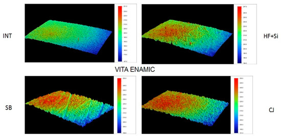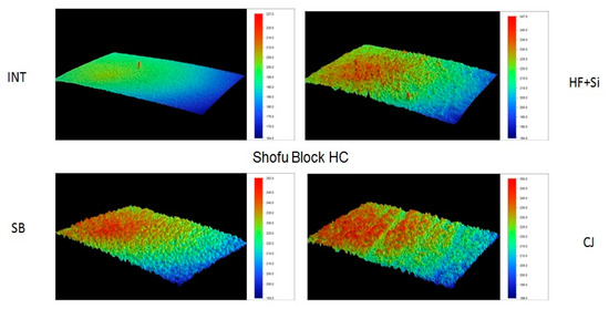 In particular, it was found that, for SH, the pairs of SB vs. HF + Si (p = 0.593) and HF + Si vs. CJ (p = 0.249) for Sa, and SB vs. CJ (p = 0.075) for Sz were not significantly different; for LV, the pairs of SB vs. CJ for both Sa (p = 0.364) and for Sz (p = 0.955) were not significantly different; for BR, the pairs of SB vs. HF + Si (p = 0.999), SB vs. CJ (p = 0.939), and HF + Si vs. CJ for Sa (p = 0.987), and INT vs. HF + Si (p = 0.065), and SB vs. CJ (p = 0.747) for Sz were not significantly different; finally, for ENm the pairs of SB vs. HF + Si (p = 0.248) and SB vs. CJ (p = 0.730) for Sa, and SB vs. HF + Si (p = 0.577), SB vs. CJ (p = 0.055) and HF + Si vs. CJ (p = 0.970) for Sz were not significantly different. All the other pairs of treatments for any type of material were found to differ significantly for both Sa and Sz (p < 0.05).