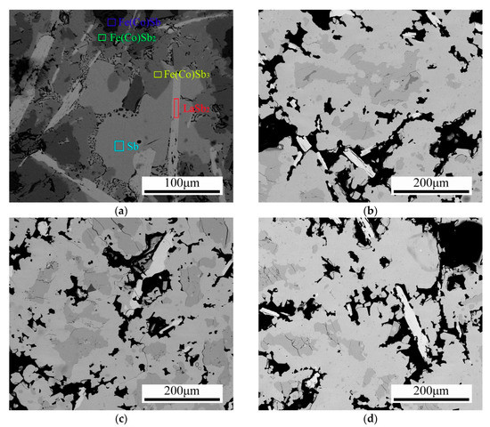 Figure 1 shows the microstructure of La0.8Ti0.1Ga0.1Fe3CoSb12, as-water-quenched and annealed at 973 K for different times. The as-quenched sample (Figure 1a) mainly contained the primary (Fe,Co)Sb dendrites, the first peritectic phase (Fe,Co)Sb2, the second peritectic skutterudite phase (Fe,Co)Sb3, eutectic Sb and some laminar LaSb2 phases. The EDS results indicated that the solid solubility of La in (Fe,Co)Sb and (Fe,Co)Sb2 was nearly zero.