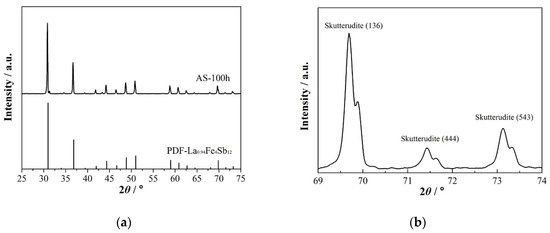 La ingot (99.8%, Alfa Aesar, Ward Hill, MA, USA), Ti ingot (99.995%, Alfa Aesar, Ward Hill, MA, USA), Ga ingot (99.999%, Alfa Aesar, Ward Hill, MA, USA), Sb balls (99.999%, Alfa Aesar, Ward Hill, MA, USA), Co ingot (99.95%, Alfa Aesar, Ward Hill, MA, USA) and Fe ingot (99.99%, Alfa Aesar, Ward Hill, MA, USA) were weighted according to the chemical composition of La0.8Ti0.1Ga0.1Fe3CoSb12 and loaded into a carbon crucible, and then were sealed in quartz tubes under vacuum below 10−3 Pa. Here, Ti and Ga were introduced to enhance the total filling fraction of the fillers and to stabilize the p-type skutterudite crystal [29,30]. The quartz tubes were heated to 1373 K at a speed of 10 K min−1 and kept for 4 h to obtain the smelted ingot. One smelted ingot was annealed at 973 K for 100 h and ground into fine powders (<50 µm) and then sintered using the DC hot-pressing at 923 K for 5 min under a pressure of 60 MPa, and named annealed samples. Another smelted ingot with the same chemical composition was put into a quartz tube with a 0.5 mm diameter nozzle, melted by high-frequency induction, and injected under a pressure of 0.05 MPa high purity Ar onto a copper wheel rotating with a linear speed of 60 m s−1. The melt-spinning ribbons were ground into fine powders (<50 µm) and then sintered using the DC hot-pressing equipment at 923 K for 5 min under a pressure of 60 MPa, and named melt-spinning samples.