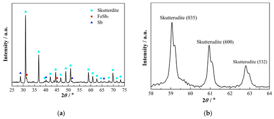 (a) The XRD pattern of the spun ribbons, with three phases: the skutterudite phase, the FeSb2 phase and the Sb phase. The main phase is the skutterudite phase. (b) The XRD pattern of the spun ribbons in the high 2-theta angle, the spinodal twin peaks of the skutterudite phase, were observed.