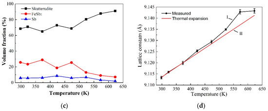 (a,b) The temperature-dependent XRD patterns of the spun ribbons. (c) The volume fraction of various phases at different temperatures. The skutterudite phase started to grow at a temperature as low as 473 K. (d) The lattice constant of the La-filled skutterudite phase at different temperatures, starting from 473 K. The increased La filling fraction also lead to the expanded lattice structure.