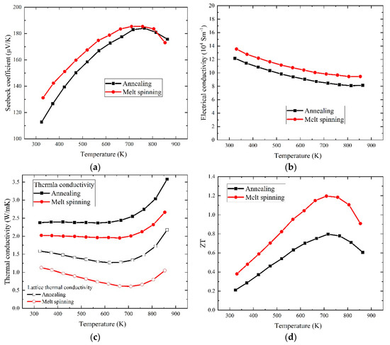 The temperature-dependent thermoelectric properties of the annealed and melt-spinning samples (a) the Seebeck coefficient, (b) the electrical conductivity, (c) the thermal conductivity and (d) the dimensionless figure of merit, ZT.