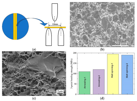 (a) The schematic representation of the three-point bending strength measurement set up. (b) The fracture microstructure of the annealed sample represented a typical transgranular fracture. (c) The fracture microstructure of the melt spinning sample represented a typical intergranular fracture. (d) The three-point bending strength. The grain-boundary strengthening greatly improved the three-point bending strength of the melt-spinning samples.