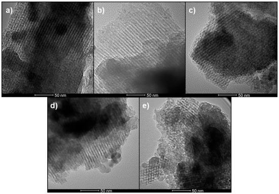 In contrast, Figure 2 shows the highly ordered porous networks associated with the ordered undoped and 5 wt% metal-doped mesoporous glasses. Except 5 wt% Ce-MSG (Figure 2e), in the images of other ordered MSGs, just the lateral view (along the length of mesopores) of the mesoporous structures were seen. In the case of 5 wt% Ce-MSG (Figure 2e), in addition to the lateral view of pore channels, a face-on view of a honeycomb structure was seen. ImageJ was used to measure the average pore size diameters of the ordered MSGs.