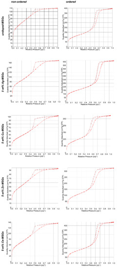 The types of hysteresis loops of all of the non-ordered MSGs were H2 type (Figure 4), which is characteristic of narrow mouth (ink-bottle shape) and relatively uniform channel-like pores [9,30]. The types of hysteresis loops of ordered MSGs were H1 type (Figure 4). This hysteresis type is associated with cylindrical pores, attributed to highly ordered mesoporous materials [31].