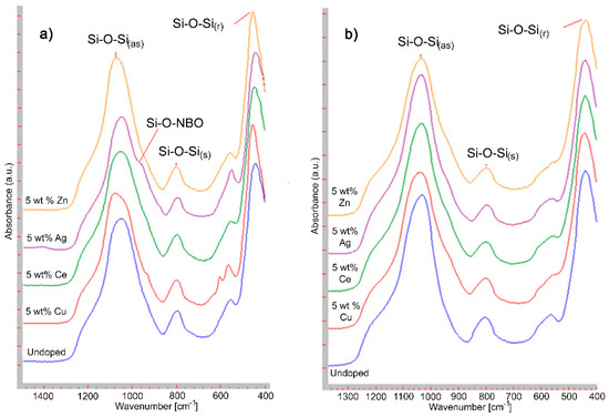 The portion of the vibrational spectra of most interest (~1400–400 cm−1) for the non-ordered mesoporous glasses can be seen in Figure 5a and for the ordered mesoporous glasses in Figure 5b. This region is of primary importance since it is dominated by the vibrational bands associated with Si-O. All samples show strong and broad bands in the range 1300–1000 cm−1, which can be assigned to the asymmetric Si-O-Si stretching mode [22]. Absorption bands centered at ~800 cm−1 in all samples result from symmetric Si-O-Si stretching modes [23], whilst bands at ~450 cm−1 can be attributed to rocking vibration modes of Si-O-Si [22,24]. Small shoulders of the main Si-O-Si stretching band at ~950 cm−1 are only visible for the non-ordered mesoporous Ag and Cu- MSGs and can be assigned as Si-O non-bonding oxygens (NBO) [22,23]. Absorption bands at ~560 cm−1 can be assigned as bending P-O vibrational mode [22,25]. In addition, all materials show a broad band (shown in the supplementary section (Figures S1 and S2) as an example for ordered 5 wt% Cu-MSG) at 3700–3000 cm−1 attributable to various vibrational modes of hydroxyl groups; hydrogen-bonded and non-hydrogen-bonded silanols and physisorbed water [22].