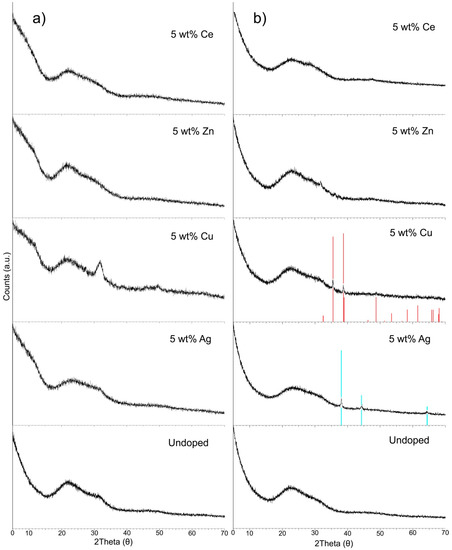 Among the ordered MSGs, 5 wt% Ag and Cu-MSGs showed silver and copper oxide peaks in their XRD diffractograms (Figure 6b); 5 wt% Zn and Ce-MSGs were amorphous. Smaller deviations in some XRD spectra are not in a relevant level to affect the amorphous situation of the MSGs. Ag2O in the glass structure can reduce to Ag in the presence of UV light. It has been shown that the addition of silver in bioactive glasses can cause an increase of crystallization of quartz and metallic silver [38]. In ethanol environment, Ag+ ions have been shown to reduce to Ag [39]. In the synthesis of ordered Ag-MSGs in this study, ethanol was also used, which might have increased the extent of Ag+ reduction into metallic silver. Similarly, Cu2+ ions present in the sol were not completely incorporated into the gel network (as given by XRF data, Table 4 and Table 5), oxidation occurred during calcination and formed a CuO phase. The CuO phase was also observed in the XRD patterns of 5, 10, and 15 mol% CuO incorporated 80SiO2-15CaO-5P2O5 BG synthesized via P123 assisted sol-gel process [27]. It was seen that with increasing Cu content in the BG, the intensity of the CuO peaks were increased.