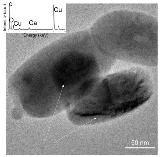 All non-ordered MSGs exhibit amorphous behavior with a halo between 15° and 40° 2θ characteristic of amorphous silicate glasses, as seen in Figure 6a. Only non-ordered 5 wt% Cu-doped MSG had an additional peak with a broad peak centered at ~30–32° 2θ. This additional peak could be due to the Cu included nanocrystalline particles, which are present in non-ordered 5 wt% Cu-doped MSG. The HRTEM analysis shows the presence of these nanoparticles (Figure 7). These particles could consist of either Cu or CuO. EDX analysis confirmed the presence of Cu in these particles (inset Figure 7). Oxygen was also detected in the spectra, but this might belong to the oxygen in the MSG composition.