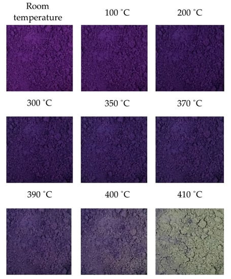 As the MV pigment samples were exposed to different high temperatures, the color changes were observed with increasing temperature from room temperature. Figure 1 presents the color changes of the samples at each temperature. The experimental results showed that the MV pigment experiences a systematic color change with increasing temperatures, as expressed in the following chemical equation: