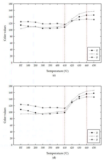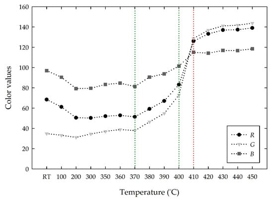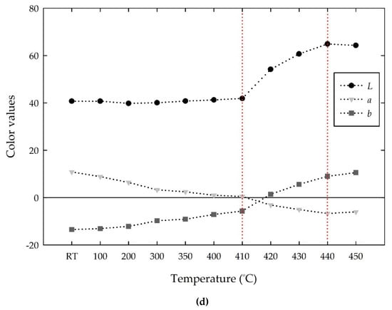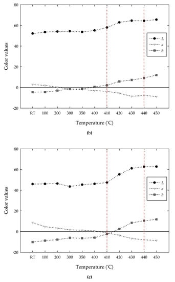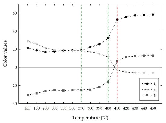 Figure 3 shows the change in the color values in the Lab space. Similar to the RGB color values, the Lab values were relatively constant from room temperature to 370 °C. At higher temperatures, the L value began to gradually increase toward lightness; b value also gradually increased, while the a value decreased. At 410 °C, the Lab color values showed a rapid change to around (52, −3, 6), respectively. The color change means a change from darkness to lightness. That is, the lightness index of the L value increased by approximately 248% from 21 at room temperature. The a value decreased from positive (28 at room temperature) to negative (−3 at 410 °C), which indicates a greenness intensity, whereas the b value increased from negative (−30 at room temperature) to positive (6 at 410 °C), which indicates yellowness. These three Lab color values at 410 °C were combined to produce a grayish yellow color. Above 410 °C, little change in the Lab values was observed.