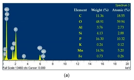 EDX analysis (EMAX-7000, HORIBA EDX system, Kyoto, Japan) was carried out to assess the changes in the mineralogical composition of the samples caused by the increase in temperature, as displayed in Figure 5. In the unaltered sample at room temperature, the EDX pattern exhibited the presence of more intense peaks of C, O, P, and Mn with the mass contents of 11.36%, 48.91%, 16.30%, and 14.56%, respectively, and less intense Al, Si, K, and Fe peaks. When exposed to 410 °C, the mass of C, O, and Mn decreased by 39%, 5%, and 1.35%, respectively, and P increased by 4.6%, in which the mass contents of the C, O, P, and Mn changes to 6.89%, 46.37%, 17.05%, and 14.37%, respectively.