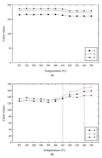 In addition, the color change was evaluated using RGB and Lab color spaces. Figure 2 shows the change in the RGB values, averaged from the images at each temperature, with increasing temperature. The RGB values decreased slightly from (68, 34, 96) to (50, 31, 79) from room temperature to 200 °C, respectively, and the RGB values were almost constant with increasing temperature until 370 °C. After that, all the RGB values began to increase gradually toward the whiteness color intensity up to 400 °C. The RGB values showed a sudden hike to (126, 128, 114) at 410 °C, which is the transition point of a color change from violet to white. Above 410 °C, the RGB values were stable as an irreversible white color. As a result, the RGB values at 410 °C were approximately 1.85, 3.76, and 1.19 times those at room temperature, respectively.