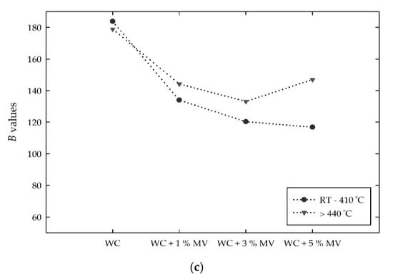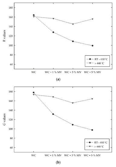 With increasing pigment content, the mean RGB values of the mixed samples from room temperature to 410 °C, in which the color of the samples was stable, were compared with those at a critical temperature of 440 °C, as shown in Figure 10. Compared to R values in between room temperature and 410 °C, those at 440 °C increased by approximately 22%, 33%, and 55% in the WC + 1% MV, WC + 3% MV, and WC +5 % MV specimens, respectively, as shown in Figure 10a. At a critical temperature of 440 °C, which completely changed to a grayish green color, the mixed samples with 1%, 3%, and 5% pigment showed R values in the range of 144 to 155. This indicates that the R value decreased due to the inclusion of pigment at room temperature, but increased to a similar range at a critical temperature of 440 °C. Figure 10b shows the change in G values for the white cement mixed samples. With increasing MV pigment, the G values decreased at room temperature. At 440 °C, the G values of the white cement with 1%, 3%, and 5% of MV pigment increased by 28%, 42%, and 68%, respectively, and showed a similar range of 155 to 168, irrespective of the content of MV pigment. Figure 10c shows the change in the B value for the white cement mixed samples. The B intensities, which were also stable between room temperature and 410 °C, decreased from approximately 183 to 116 with increasing content of MV pigment from zero to 5%. The B value at the critical temperature of 440 °C increased to 144, 133, and 146, which corresponds to a 7%, 10%, and 25% increase for the white cement samples with 1%, 3%, and 5%, respectively. The addition of pigments decreased the B values, but the amount of the increase is relatively small compared to that of the R and G values.