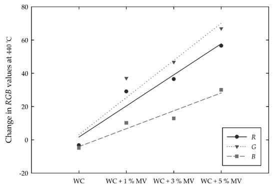 Similarly, the L value increased by approximately 23%–60% at 440 °C. The a value changed from positive to negative, and the b value changed from negative to positive. The changes in the Lab values also increased almost linearly with increasing MV pigment content. According to the linear trend analyses, the magnitude of the Lab values at 440 °C changed by approximately 4.7, 3.6, and −2.1, respectively, and the RGB values increased by approximately 10.9, 13.0, and 6.5, respectively, per 1% increase in MV pigment. In addition, the total changes in the RGB and Lab color intensities at the critical temperature of 440 °C, defined as the Euclidean distance, showed the increasing rates of approximately 14.7 and 5.8 per 1% addition of MV pigment to white cement.
