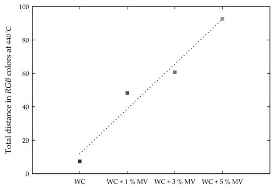 Total distance in the RGB intensities for the white cement (WC) mixed samples with increasing MV pigment content at 440 °C.