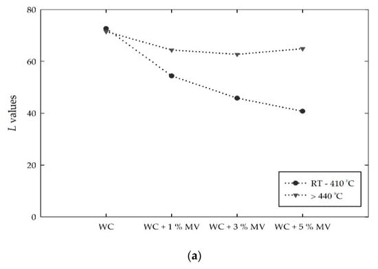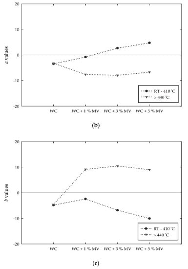 Figure 13 shows the changes in the Lab values of the white cement mixed samples with increasing temperature. The white cement exhibited a constant high L value of approximately 72, and the a and b values present negative constant values of approximately −3 and −4, respectively, with increasing temperature from room temperature to 450 °C, as shown in Figure 13a. This suggests that the white cement is stationary with increasing temperature. The addition of MV pigment decreased the L and b values, whereas it increased the a value at room temperature, as shown in Figure 13b–d. The mixed samples with 1%, 3%, and 5% of the MV pigment showed a decrease in L value from 72 to 52, 45, and 40, corresponding to a 28%, 36%, and 43% decrease, respectively. The a value, which was −3 at room temperature for white cement, changed to positive values (redness degrees) of 2, 8, and 10 for the mixed samples with 1%, 3%, and 5% of MV pigment, respectively. In contrast, the b intensity, which was negative for the white cement, showed a further decrease to a negative value (blueness degree). The change in the Lab values influences the development of color on the mixed samples. That is, the WC + 1% MV sample with the Lab of (52, 2, −4) represents a dark grayish blue color, and WC + 3% MV and WC + 5% MV samples with the Lab of (45, 8, −10) and (40, 10, −13), respectively, illustrate dark grayish violet color at room temperature. As the temperature increased from room temperature to 410 °C, the L value was relatively constant, the a value gradually decreased from positive to negative, and the b value increased from negative to positive. However, the changes in the Lab values were too low to observe the color change of the mixed samples until 410 °C.