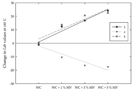 Based on the mean Lab values between room temperature and 410 °C, in which no major change was obtained in all the white cement mixed samples, Figure 15 shows the magnitude of the change in the Lab values at 440 °C. The L and b values changed to positive values, and the a values changed to negative values. That is, with increasing MV pigment from zero to 5%, the L and b values increased almost linearly from −1.9 to 23.8 and from 0.3 to 20.6, respectively, whereas the a value decreased from 0.4 to −11.1. A linear trend analysis showed that the magnitude of the L and b values at 440 °C increased by approximately 4.7 and 3.6, respectively, and the a value, the change of which was relatively small, decreased by approximately 2.1 per 1% increase in MV pigment.