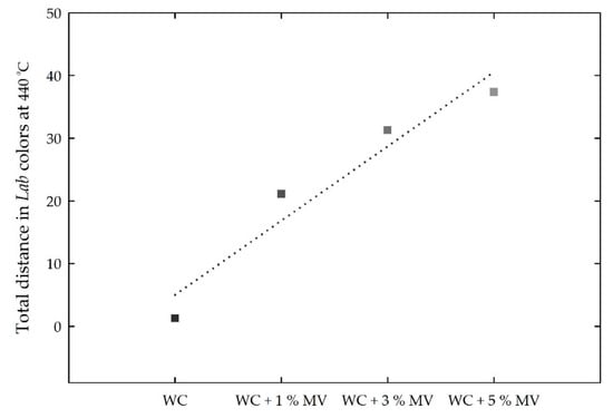 Total distance in the Lab intensities for the white cement (WC) mixed samples with increasing MV pigment content at 440 °C