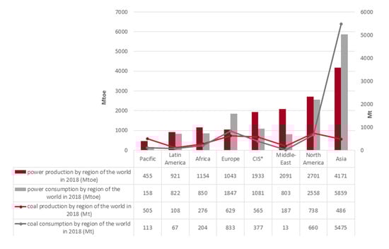 Coal usage for energy production has fallen due to environmental protection reasons, but coal is still a strategic raw material used around the world. Despite this fact, 2018 was the third consecutive year reporting coal production growth (about +1.9% in relation to 2017). The leadership position of coal and lignite production was maintained by China (covering about 45% of global production) []. In 2018, coal consumption on a global scale recorded a rise of about +0.9% driven primarily by Asia (+1.8%) [] (Figure 1).