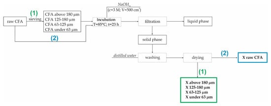 A total of 20 g of CFA (both CFA and separated fractions) was mixed with the alkali activating agent in a water solution (CNaOH = 3 M; VNaOH = 500 cm3). The mixture was then incubated at 85 °C for 23 h under static conditions and atmospheric pressure. After this process, the solid product was filtered and washed in distilled water several times. A flow chart for one of the samples is shown in Figure 2. All syntheses of zeolites from separated fractions (1) and raw CFA (2) (used as a comparative material) were carried out in the same manner.